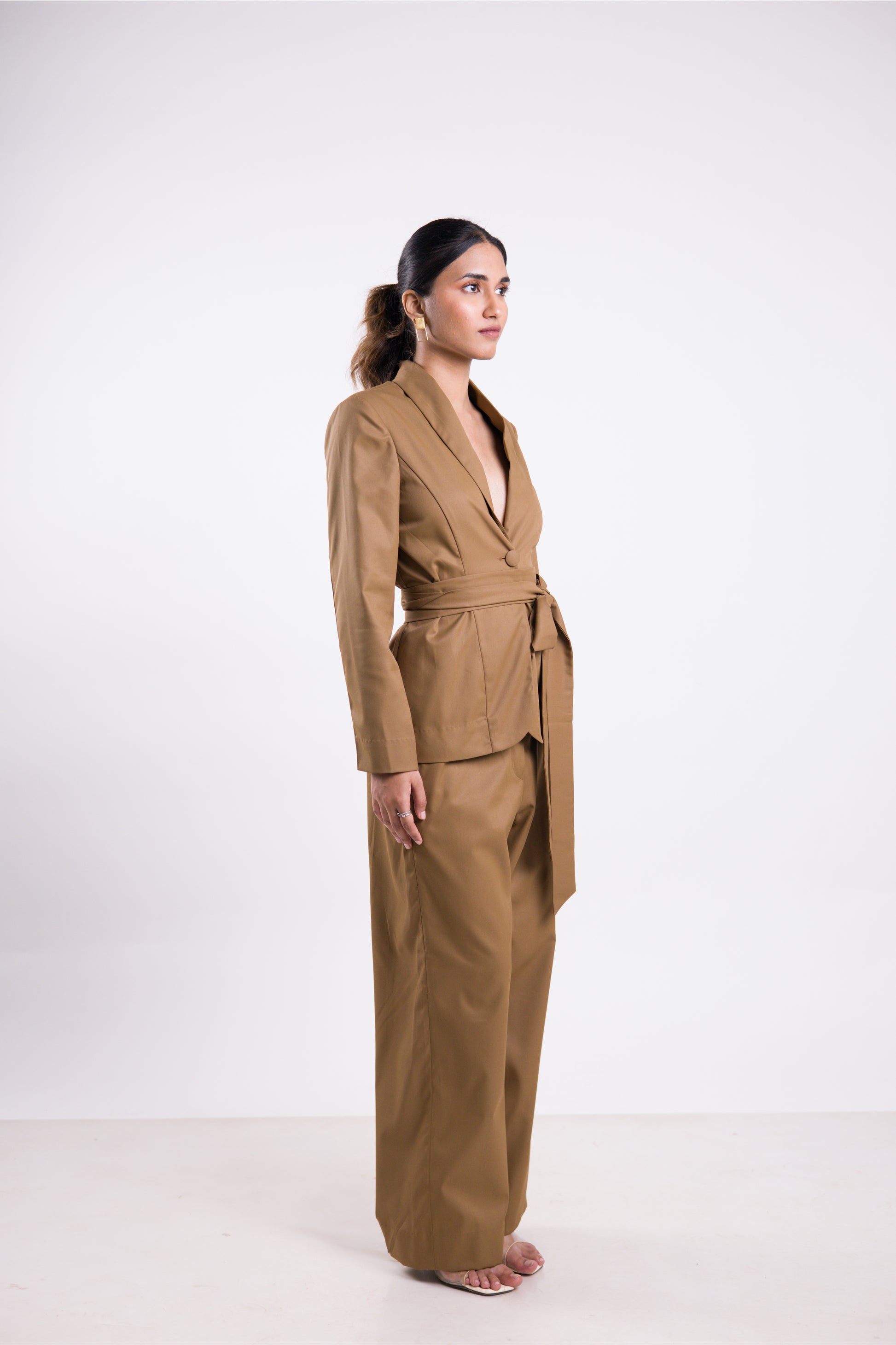 Structured meets effortless in the Dune Set, a contemporary power look with a twist. The standout tie-up blazer brings a modern edge to classic tailoring, cinching the waist for a flattering, adjustable fit. Paired with sleek straight-leg trousers that elongate the silhouette, this set blends sophistication and ease. Perfect for elevating your workwear or making a statement at after-hours events.